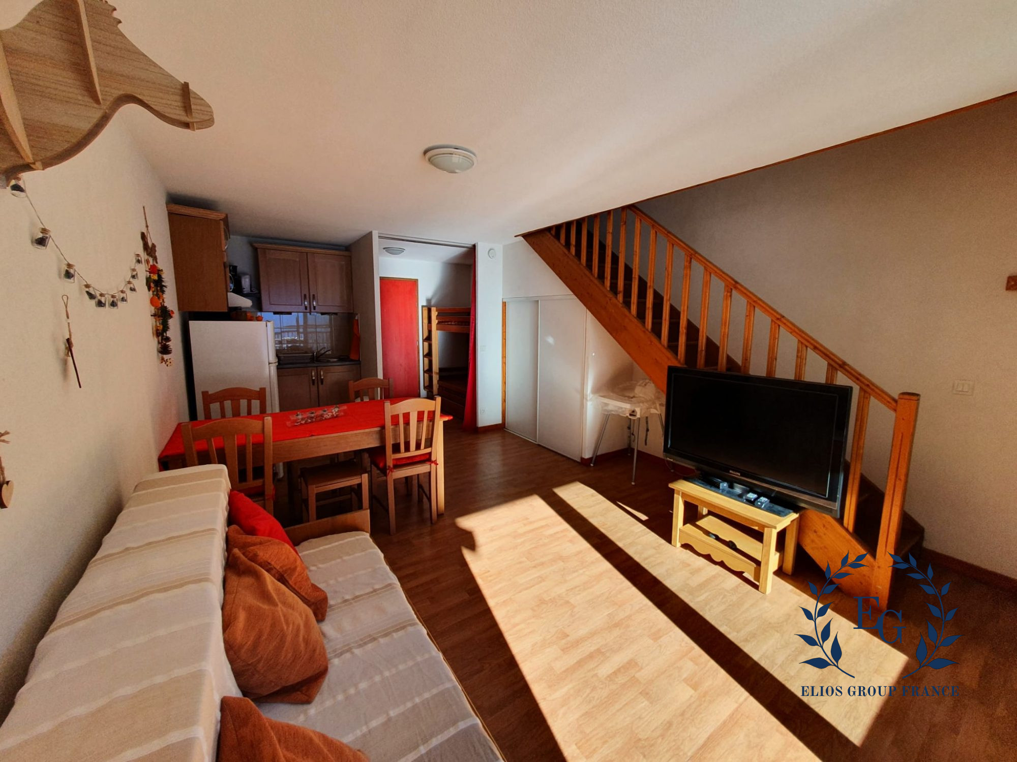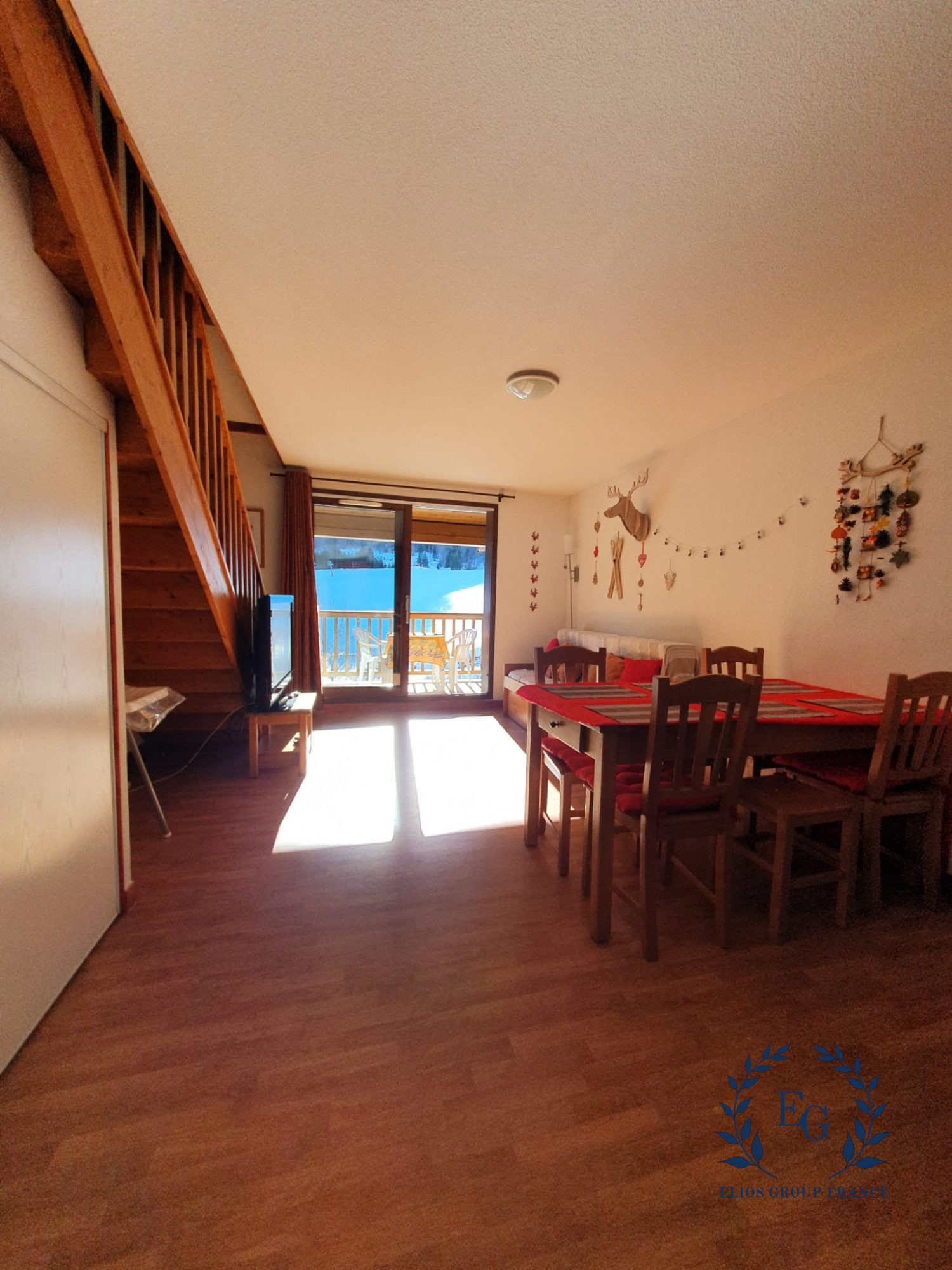 Situé au deuxième et dernier étage, ce T2 duplex avec coin montagne bénéficie d’un excellent ensoleillement et d’une terrasse avec une vue magnifique sur les pistes enneigées en hiver ou les forêts verdoyantes l’été.